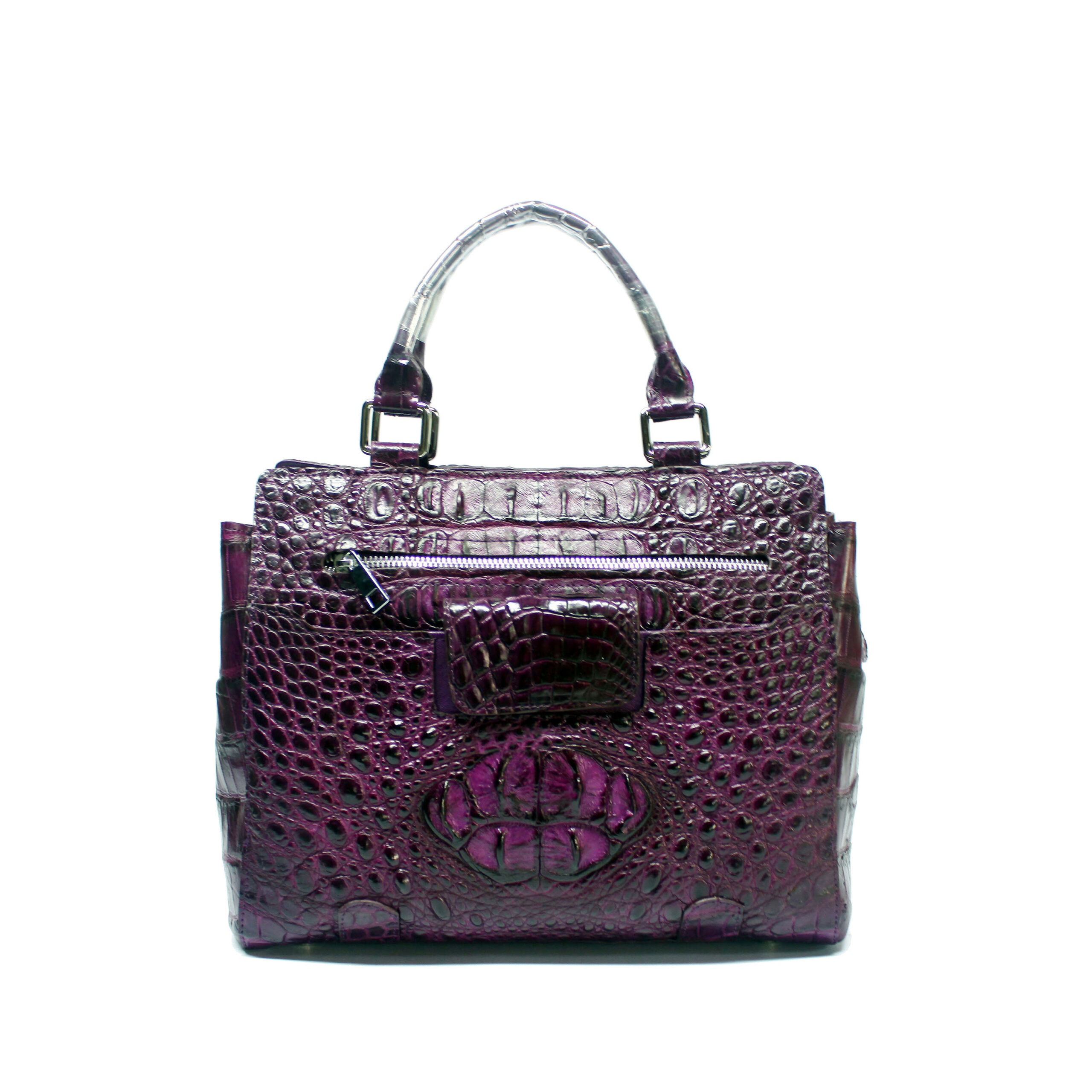 Crafted from premium crocodile leather, this handbag features a structured rectangular shape and a striking aurora purple hue. Its sleek and glossy finish, along with the distinctive crocodile skin texture, makes it a standout piece. The slightly curved top handle with gold hardware and the engraved “JANEJIRA” clasp add a touch of sophistication and elegance. Dimensions : W22 x H19 x D11 cm Material : Crocodile leather , Lining – Sheep skin Interior: 2 compartments Hardware: 18k gold-plated brass. Weight: 0.270 kg approximately Handmade Made in Thailand